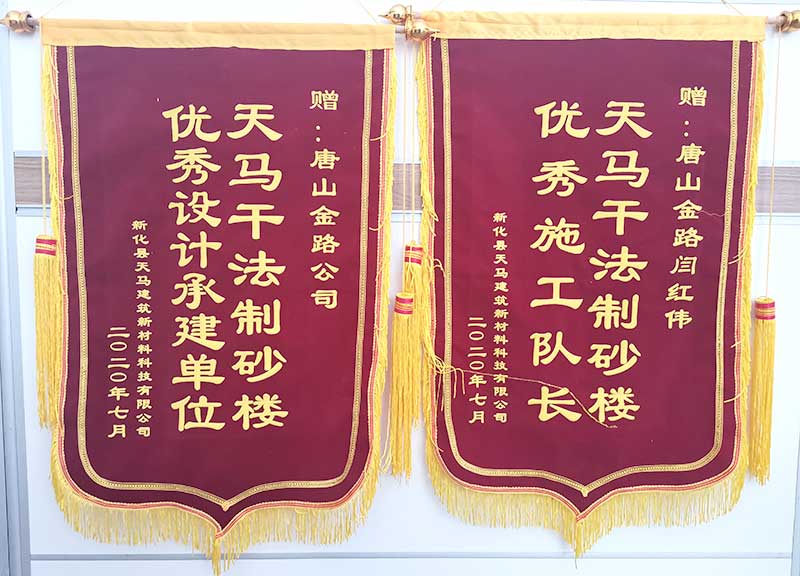 近日,天馬建筑項目負責人將兩面印有“天馬干法制砂樓,優(yōu)秀設(shè)計承建單位”、“天馬干法制砂樓,優(yōu)秀施工隊長”的錦旗送到了唐山金路安裝隊長閆紅偉的手上。